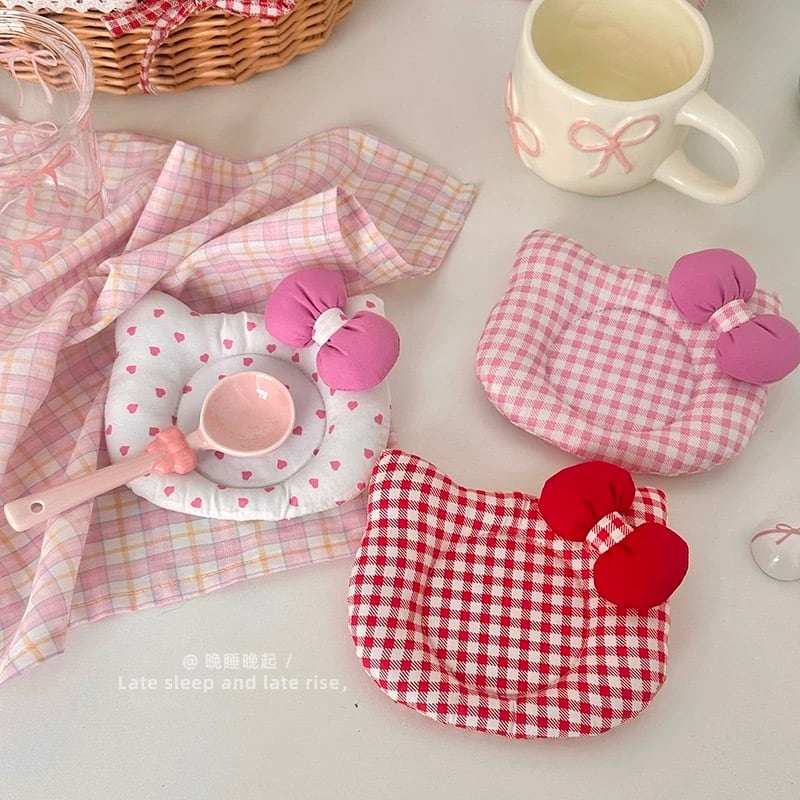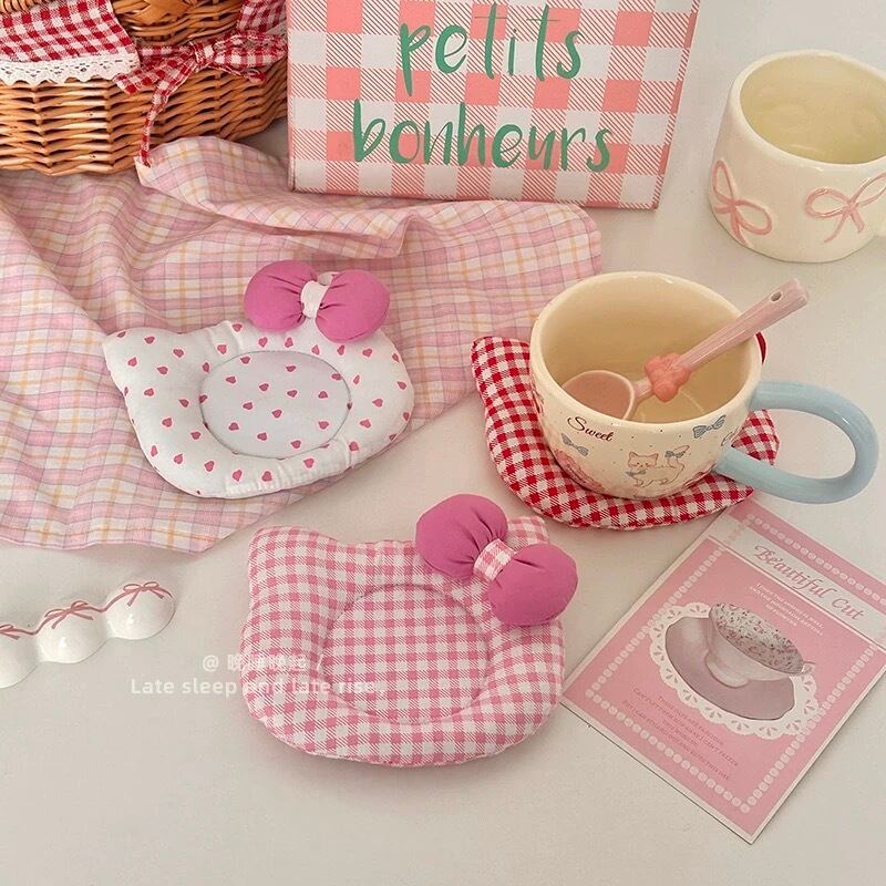 猫ちゃんコースター ネコ ギンガムチェック ふわふわ もこもこ 背景布 ラブリー 花柄 繊細レース ファブリック 北欧インテリア 韓国インテリア 韓国雑貨