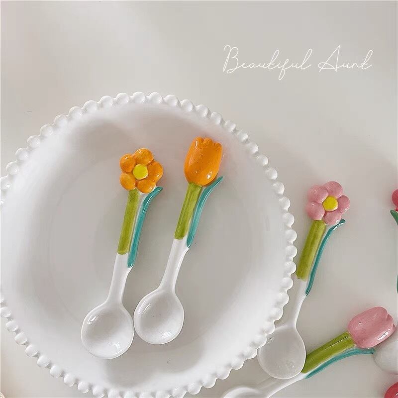 お花のスプーン カラフル 花柄 チューリップ シンプルカトラリーセット ホワイトインテリア ナチュラル セラミック 陶器 カトラリー スプーン フォーク ヴィンテージ 韓国インテリア 韓国雑貨