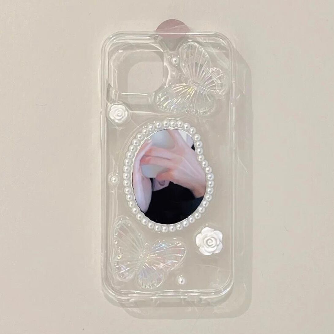 蝶のiPhoneケース 나비 ミラー 鏡付き バタフライ ナビ 蝶々 レジン クリアケース スマホ ニュアンスカラー オレンジ ベージュ 韓国ファッション 韓国雑貨
